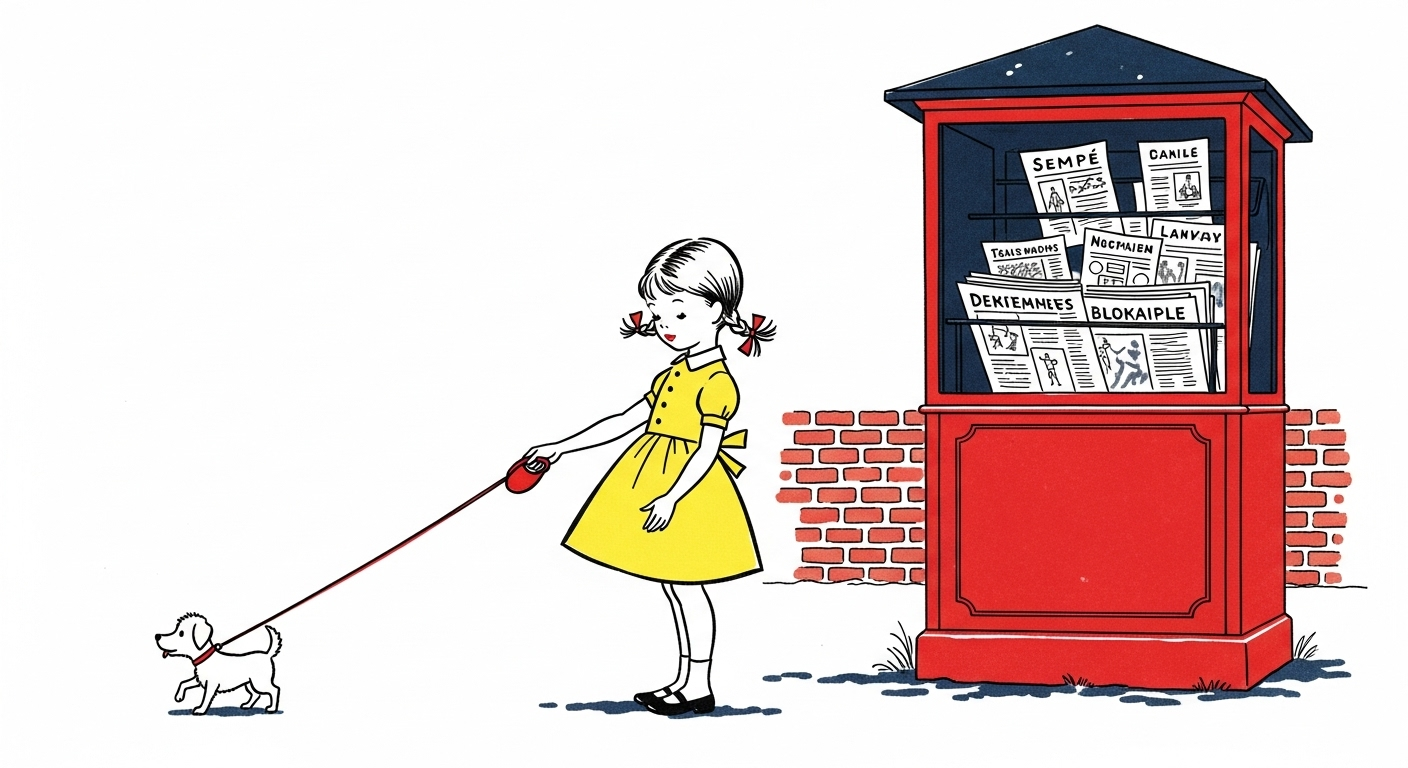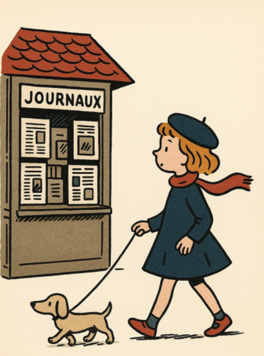 A classic French children’s book illustration from the 1950s, showing a girl walking a tiny dog on a leash, pausing near a newspaper kiosk. Clean black ink lines, flat muted colors like navy blue and brick red, white background. Inspired by Sempé and Jean de Brunhoff.