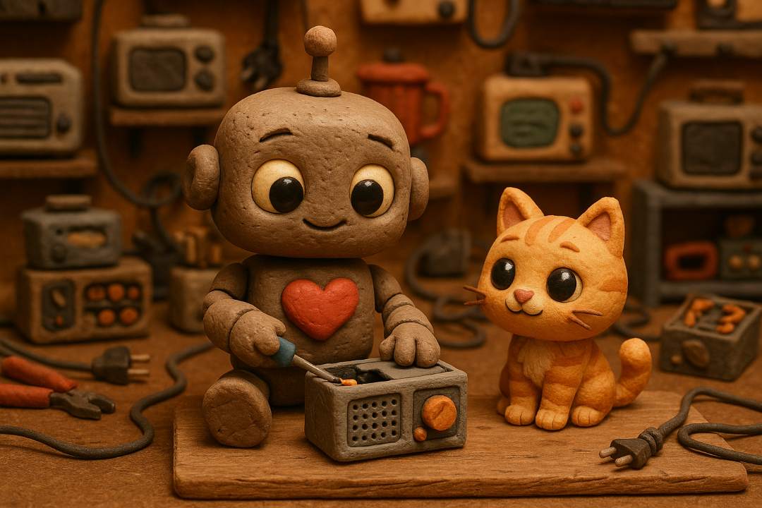 In a clay animation style, an irresistibly cute robot with heart-melting charm is repairing a pile of electronics in a busy workshop. A curious little kitten watches nearby, as if cheering it on.