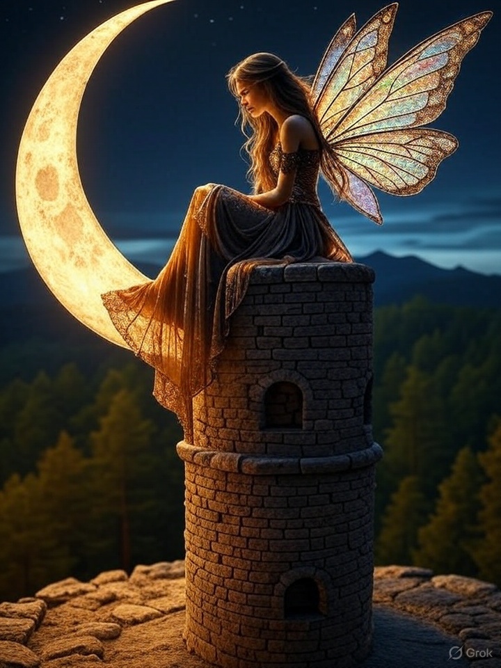 A beautiful fairy with butterfly wings sits on the crescent moon, perched atop an ancient tower in the style of digital art, with orange and gold tones, a dark background, hyper-realistic illustrations, paper sculptures, dark and light amber hues, and illuminated details, creating a fantasy realism scene.
