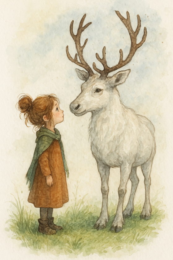 A young girl with a messy bun hairstyle stands in the grass, gazing up at her white reindeer companion. This is a detailed watercolor illustration with a light background.