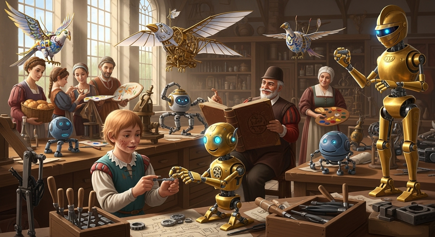 In one corner, a group of human artisans, their expressions a mix of concentration and quiet joy, meticulously paint delicate patterns onto the chassis of a newly assembled robotic bird, while a smaller, multi-limbed robot holds up a palette of vibrant, jewel-toned paints for them. Another human, perhaps a kindly matron, shares a basket of freshly baked bread with a tiny, spherical cleaning bot that happily trundles around, tidying up stray gears and wood shavings.